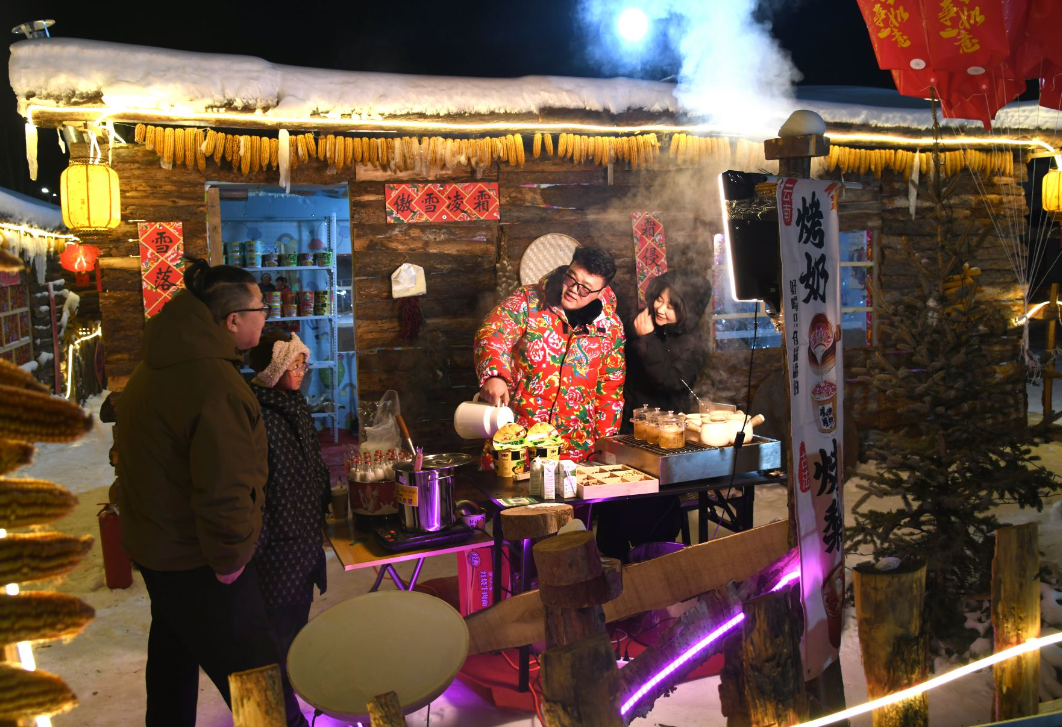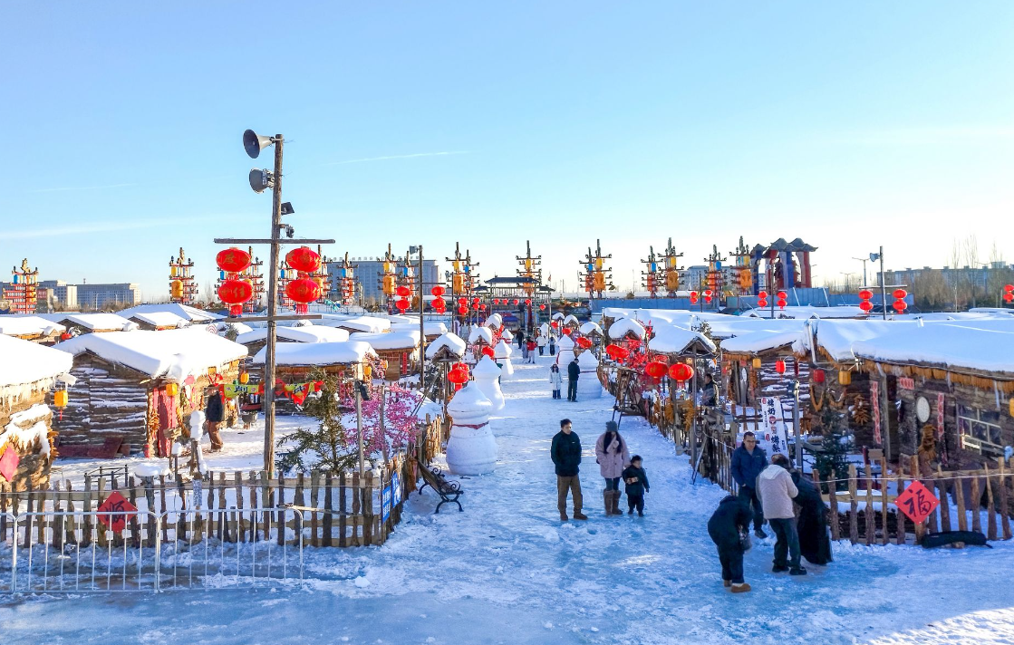 踏入雪鄉(xiāng)板塊,50個復刻北方傳統(tǒng)風貌的院落集群映入眼簾,木柵欄上垂掛的紅燈籠與蓬松雪層相映成趣,屋檐下懸垂的雪舌、雪簾勾勒出童話般的輪廓。每個院落都藏著專屬打卡場景,推門而入可見家庭場景,窗外是皚皚白雪,屋內(nèi)飄著燒烤、火鍋和奶茶的醇厚香氣,瞬間驅散冬日寒意。游客穿梭其間,鈴鐺輕響,為這份雪鄉(xiāng)煙火氣增添了濃郁的民族風情。