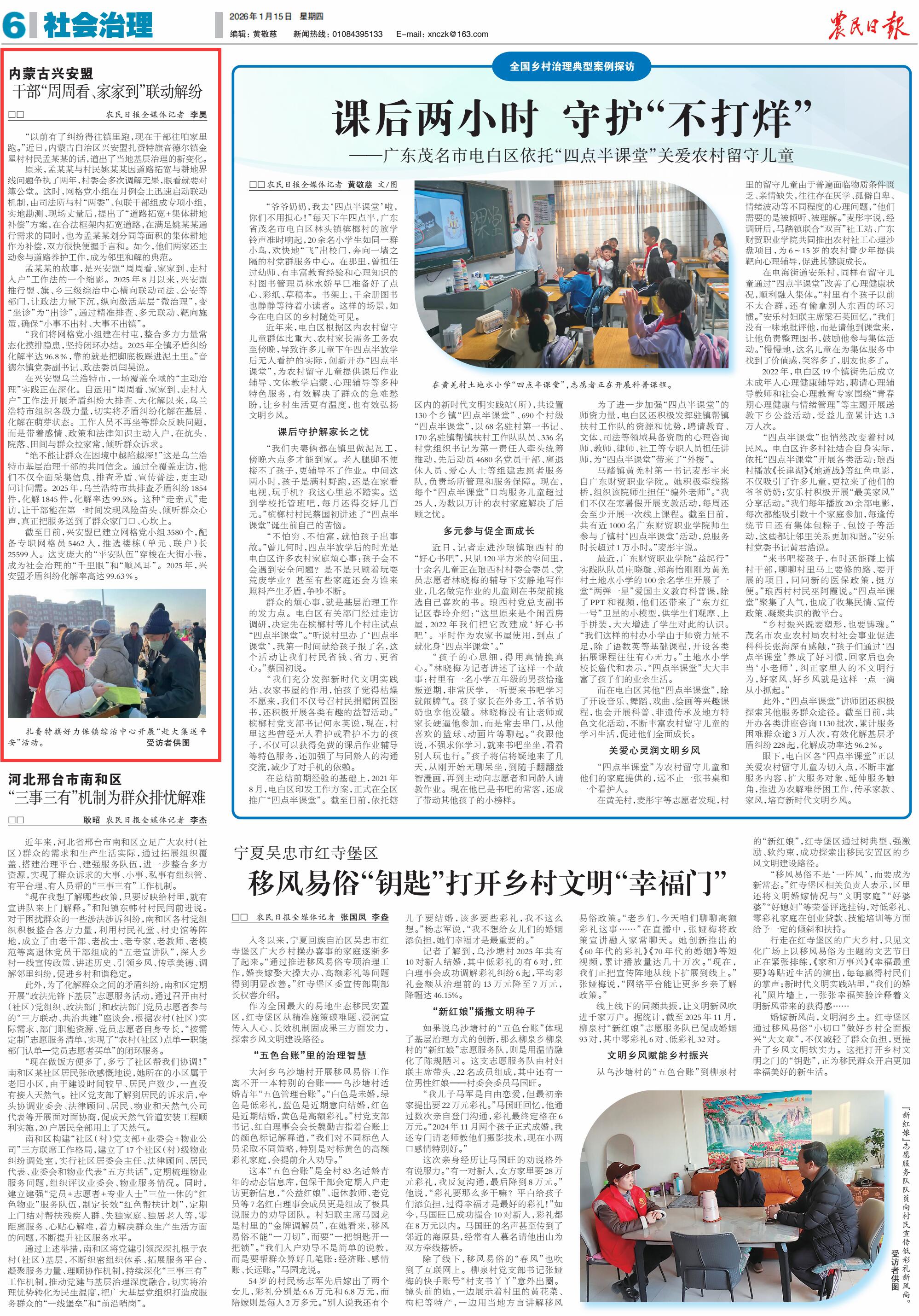 2026年1月15日,《農(nóng)民日?qǐng)?bào)》第6版刊發(fā)題為《內(nèi)蒙古興安盟 干部“周周看、家家到”聯(lián)動(dòng)解紛》的文章,報(bào)道了2025年8月以來(lái),興安盟推行盟、旗、鄉(xiāng)三級(jí)綜治中心橫向聯(lián)動(dòng)司法、公安等部門(mén),讓政法力量下沉,縱向激活基層“微治理”,變“坐診”為“出診”,通過(guò)精準(zhǔn)排查、多元聯(lián)動(dòng)、靶向施策,確?!靶∈虏怀龃?、大事不出鎮(zhèn)”。