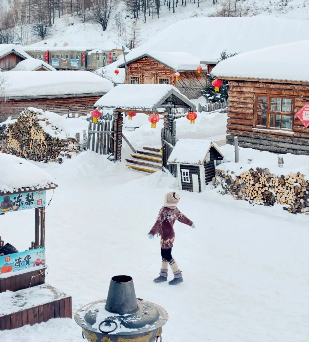 登上白狼峰觀景臺,俯瞰一望無際的林海雪原,夕陽西下時,整片雪原被染成溫柔的金色,寒風掠過,雪花漫舞,這一刻的壯闊,足以治愈所有煩惱。走進阿爾山雪村,木刻楞房頂著圓滾滾的“雪蘑菇”,紅燈籠在白雪中搖曳,晚上燈光一亮,暖黃色的光灑在雪上,感覺自己在童話里 。