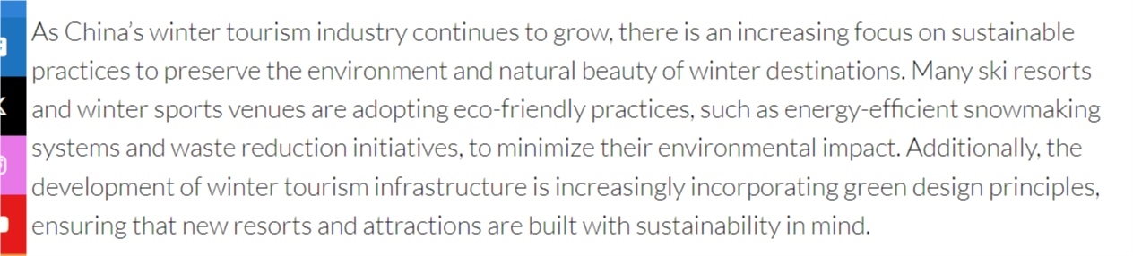 文章還說(shuō),隨著中國(guó)冬季旅游產(chǎn)業(yè)的不斷壯大,可持續(xù)發(fā)展理念、環(huán)保實(shí)踐也日益受到重視。中國(guó)正成為越來(lái)越有吸引力的冬季旅游目的地。
