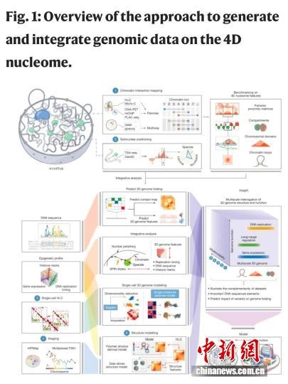 該論文介紹,人類染色體的三維組織結(jié)構(gòu),對(duì)于協(xié)調(diào)遺傳物質(zhì)調(diào)控生物反應(yīng)過程起到重要作用。DNA纏繞組蛋白形成名為染色質(zhì)的復(fù)合體,存儲(chǔ)在細(xì)胞核內(nèi)。大量染色質(zhì)位點(diǎn)可通過生物化學(xué)修飾來調(diào)控基因表達(dá)。繪制這一三維結(jié)構(gòu)及其如何經(jīng)時(shí)(第四維度)改變的工作,被稱為4D核組學(xué)。