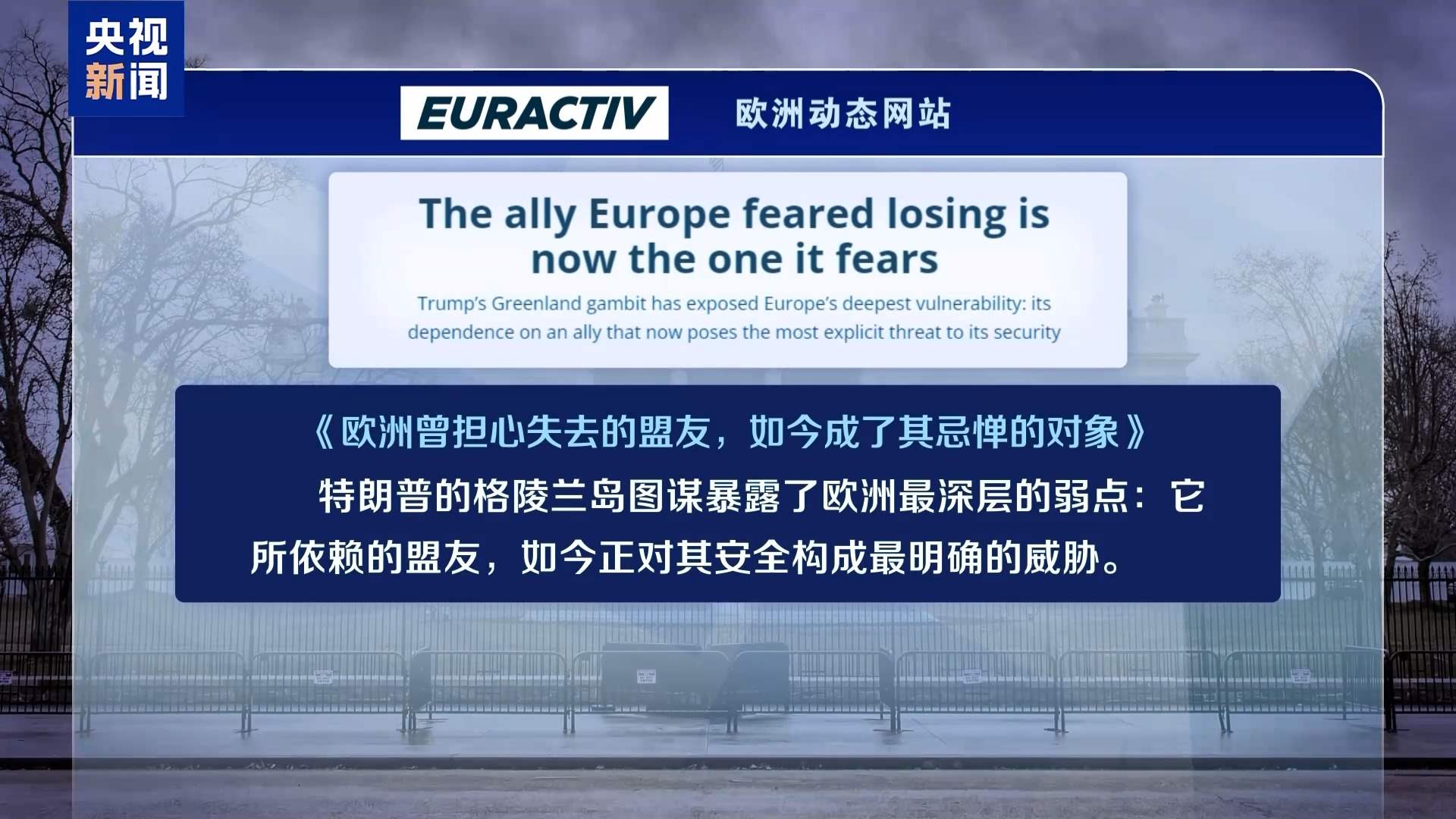 歐洲動(dòng)態(tài)網(wǎng)站6日以《歐洲曾擔(dān)心失去的盟友,如今成了其忌憚的對象》為題評論說,“特朗普的格陵蘭島圖謀暴露了歐洲最深層的弱點(diǎn):它所依賴的盟友,如今正對其安全構(gòu)成最明確的威脅。”文章還提醒說,我們正進(jìn)入一個(gè)“強(qiáng)權(quán)即公理”的新世界——而歐洲人對此毫無準(zhǔn)備?;蛟S,格陵蘭島可能帶來的羞辱,將促使歐洲人反思這一現(xiàn)狀,并最終采取行動(dòng)改變局面。