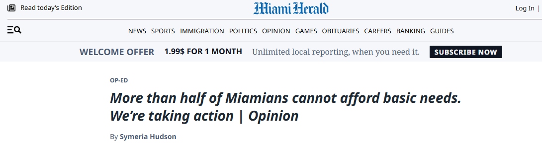 文章表示,在邁阿密,現(xiàn)實令人清醒:戴德縣超過五十萬個家庭難以負擔(dān)住房、食品、醫(yī)療、托兒、交通和技術(shù)等必需品和服務(wù)。家庭收入與實際生活成本之間的差距持續(xù)擴大。西默里亞·哈德森在文中強調(diào),這些挑戰(zhàn)并非抽象概念。當(dāng)家庭被迫在支付房租和喂養(yǎng)孩子之間作出選擇時,這并非個人失敗,而是系統(tǒng)性問題。這需要企業(yè)領(lǐng)導(dǎo)者、政策制定者、教育者、醫(yī)療系統(tǒng)、非營利組織和普通公民共同努力。