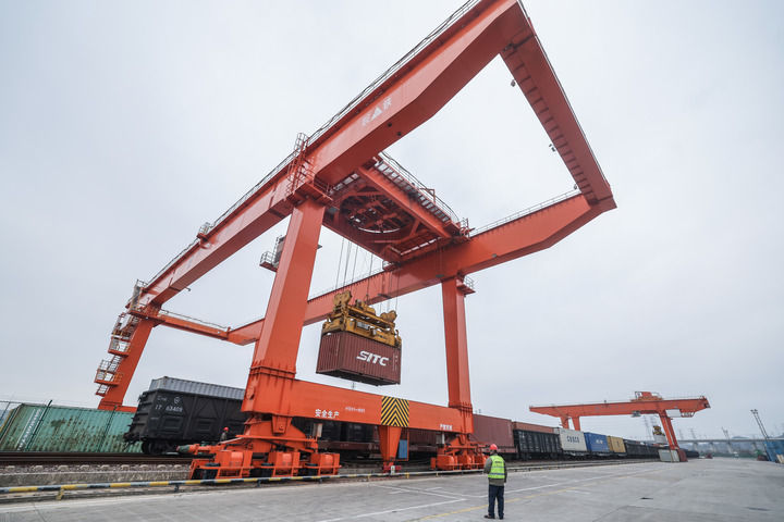 2026年1月30日,在義烏鐵路口岸,一列載著進口商品的中歐班列回程班列在卸貨。新華社記者 徐昱 攝