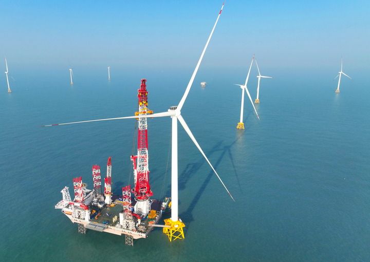 2026年1月13日在福建閩南海域拍攝的“大橋海風(fēng)”號2000噸自升式海上風(fēng)電安裝平臺和20兆瓦風(fēng)電機組吊裝現(xiàn)場(無人機照片)。新華社記者 林善傳 攝
