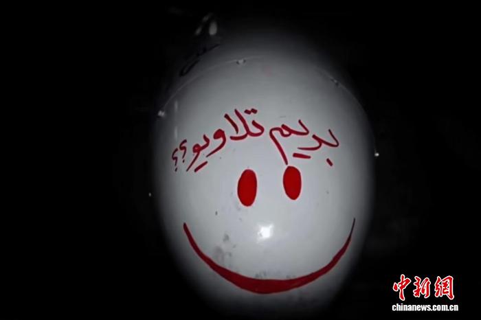 伊朗法爾斯通訊社發(fā)布的圖片顯示,伊朗伊斯蘭革命衛(wèi)隊(duì)向以色列特拉維夫發(fā)射的“目擊者-136”無人機(jī),彈頭上用波斯語寫著“我們?nèi)ヌ乩S夫吧”,并畫了個(gè)笑臉。
