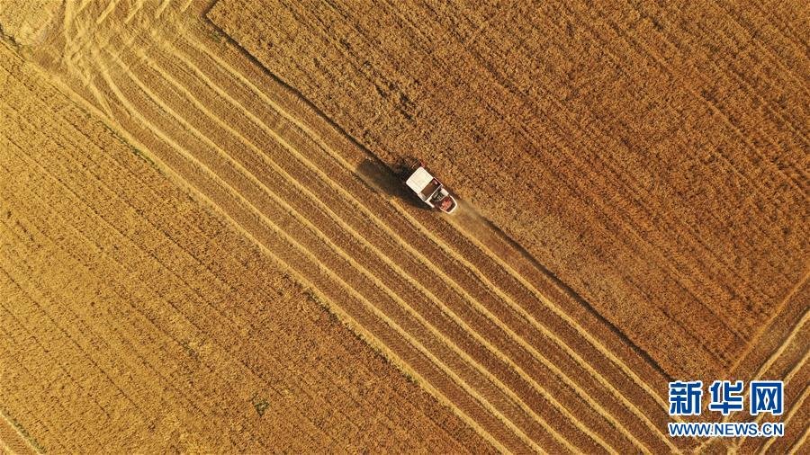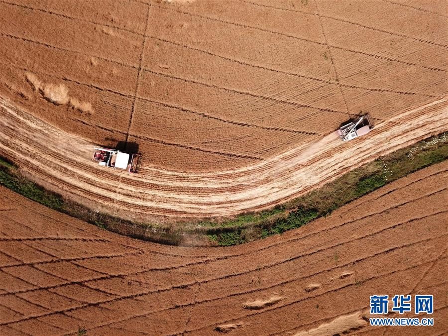 6月2日,在合肥市蜀山區(qū)小廟鎮(zhèn)馬崗村,農(nóng)機手操作機械設(shè)備收割小麥(無人機照片)。 “三夏”時節(jié),安徽各地麥收進入高峰期,農(nóng)民搶收小麥,確保顆粒歸倉。新華社記者劉軍喜攝