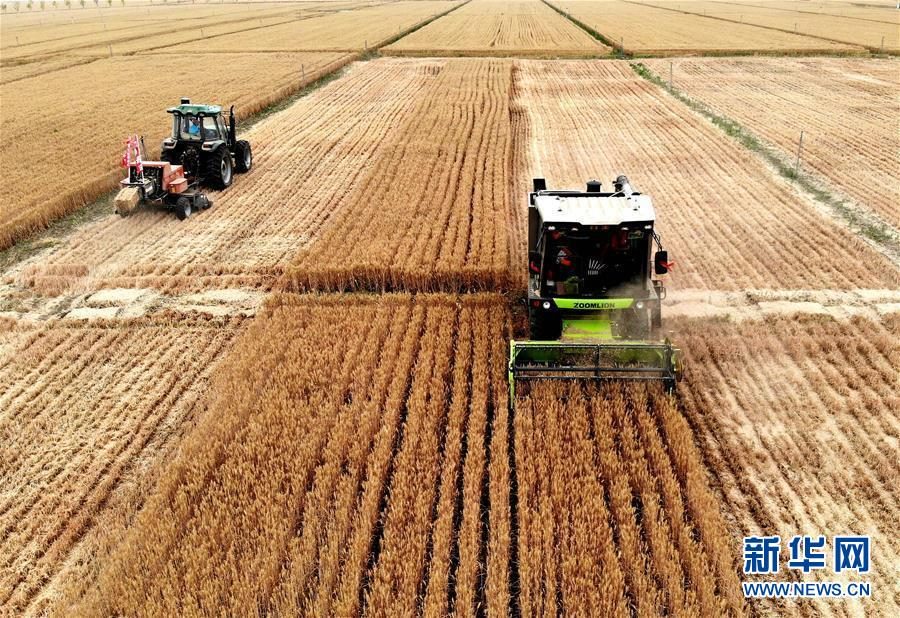 5月29日,在河南省商水縣南陵村的一處麥田里,農(nóng)機手操作收割機和小麥秸稈打捆機(無人機照片)。眼下,“中原糧倉”河南迎來豐收季,各地農(nóng)民搶抓農(nóng)時收割小麥。截至5月29日17時,全省已收獲小麥3315萬畝,日投入聯(lián)合收割機7.8萬臺。新華社記者李安攝