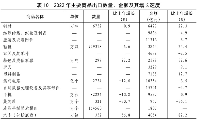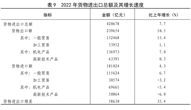 全年貨物進(jìn)出口總額420678億元,比上年增長(zhǎng)7.7%。其中,出口239654億元,增長(zhǎng)10.5%;進(jìn)口181024億元,增長(zhǎng)4.3%。貨物進(jìn)出口順差58630億元,比上年增加15330億元。對(duì)“一帶一路”[40]沿線國(guó)家進(jìn)出口總額138339億元,比上年增長(zhǎng)19.4%。其中,出口78877億元,增長(zhǎng)20.0%;進(jìn)口59461億元,增長(zhǎng)18.7%。對(duì)《區(qū)域全面經(jīng)濟(jì)伙伴關(guān)系協(xié)定》(RCEP)其他成員國(guó)[41]進(jìn)出口額129499億元,比上年增長(zhǎng)7.5%。