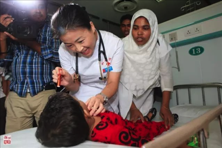 2013年,“和平方舟”號醫(yī)院船再次來到孟加拉國。上萬民眾自發(fā)涌向中國醫(yī)院船,最高單日門診1700余人次。3歲的阿里法·沁健康么?中國軍醫(yī)牽掛著她。她家住在偏僻農(nóng)村,中國軍醫(yī)設(shè)法找到了她,邀請她登上“和平方舟”號醫(yī)院船體檢。