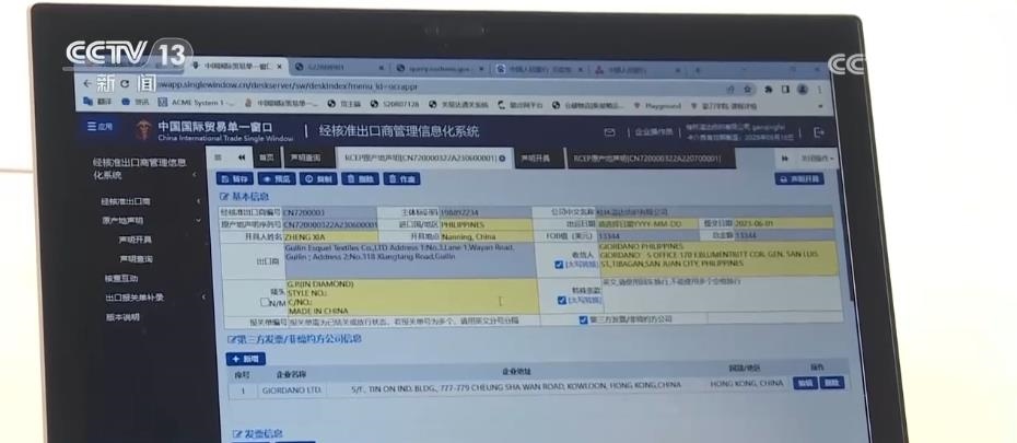 當(dāng)日,廣西桂林一家紡織企業(yè)通過(guò)國(guó)際貿(mào)易“單一窗口”申報(bào),為一批出口到菲律賓的貨物自主出具了廣西首份RCEP原產(chǎn)地聲明,貨值約9萬(wàn)元,在菲律賓享受關(guān)稅優(yōu)惠約1.3萬(wàn)元。2022年,這家紡織企業(yè)作為海關(guān)高級(jí)認(rèn)證企業(yè),率先認(rèn)證成為廣西紡織領(lǐng)域首家“經(jīng)核準(zhǔn)出口商”。