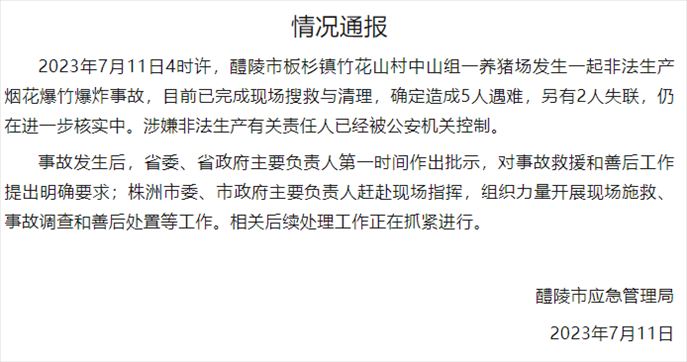 ·11日,湖南醴陵發(fā)生一起非法生產(chǎn)煙花爆竹爆炸事故,造成5人遇難,2人失聯(lián),涉嫌非法生產(chǎn)有關(guān)責任人已被公安機關(guān)控制,案件仍在進一步核實中。