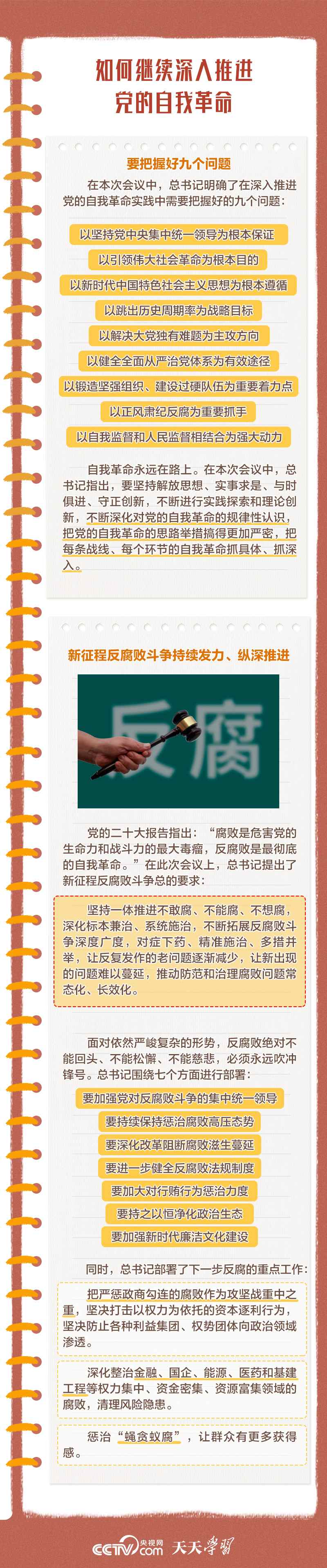 勇于自我革命是我們黨最鮮明的品格和最大的優(yōu)勢,總書記多次對推進(jìn)黨的自我革命作出重要部署。此次會議上,總書記深刻闡述了黨的自我革命的重要思想,明確提出需要把握好九個問題,并對持續(xù)發(fā)力、縱深推進(jìn)反腐敗斗爭作出戰(zhàn)略部署。央視網(wǎng)《天天學(xué)習(xí)》與您一起學(xué)習(xí)。