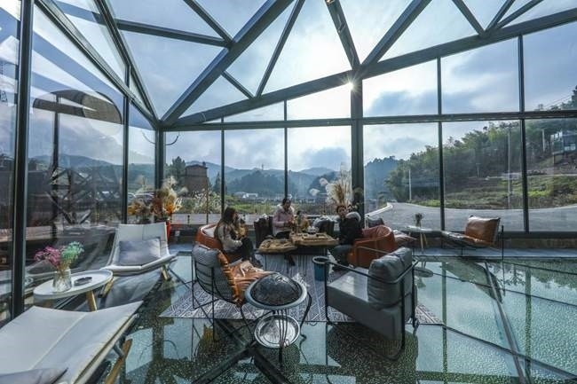 在獵神村礦咖民宿全景玻璃陽(yáng)光室,山中風(fēng)景一覽無(wú)余。熊偉攝