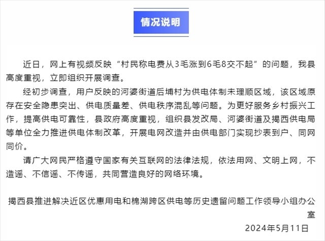 ·廣東揭陽一村電費從3毛漲到6毛8?官方回應:開展電網(wǎng)改造并實現(xiàn)抄表到戶、同網(wǎng)同價。