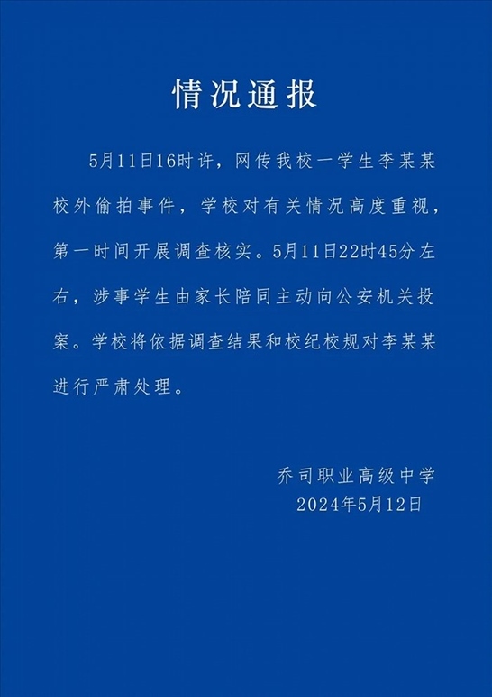 ·杭州市一職高通報學生校外偷拍女生裙底事件:涉事學生由家長陪同主動投案。