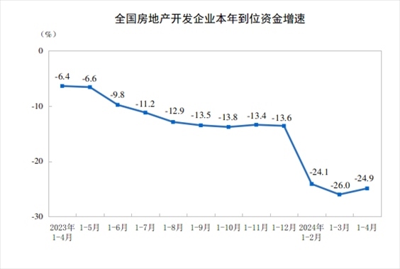 1—4月份,房地產(chǎn)開發(fā)企業(yè)到位資金34036億元,同比下降24.9%。其中,國內(nèi)貸款5583億元,下降10.1%;利用外資9億元,下降46.7%;自籌資金11736億元,下降10.1%;定金及預收款10002億元,下降37.2%;個人按揭貸款4953億元,下降39.7%。