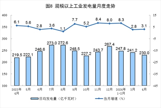 分品種看,4月份,規(guī)上工業(yè)火電、水電、太陽能發(fā)電增速加快,核電由降轉(zhuǎn)增,風(fēng)電同比下降。其中,規(guī)上工業(yè)火電同比增長1.3%,增速比3月份加快0.8個百分點;規(guī)上工業(yè)水電增長21.0%,增速比3月份加快17.9個百分點;規(guī)上工業(yè)核電增長5.9%,3月份為下降4.8%;規(guī)上工業(yè)風(fēng)電下降8.4%,3月份為增長16.8%;規(guī)上工業(yè)太陽能發(fā)電增長21.4%,增速比3月份加快5.6個百分點。