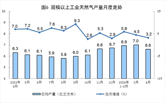 天然氣生產(chǎn)穩(wěn)定增長,進(jìn)口保持較快增長。4月份,規(guī)上工業(yè)天然氣產(chǎn)量198億立方米,同比增長3.2%,增速比3月份放緩1.3個百分點;日均產(chǎn)量6.6億立方米。進(jìn)口天然氣1030萬噸,同比增長15.1%。