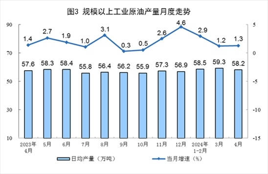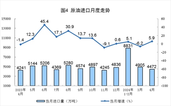 原油生產(chǎn)平穩(wěn)增長,進(jìn)口由降轉(zhuǎn)增。4月份,規(guī)上工業(yè)原油產(chǎn)量1747萬噸,同比增長1.3%,增速比3月份加快0.1個百分點;日均產(chǎn)量58.2萬噸。進(jìn)口原油4472萬噸,同比增長5.9%。