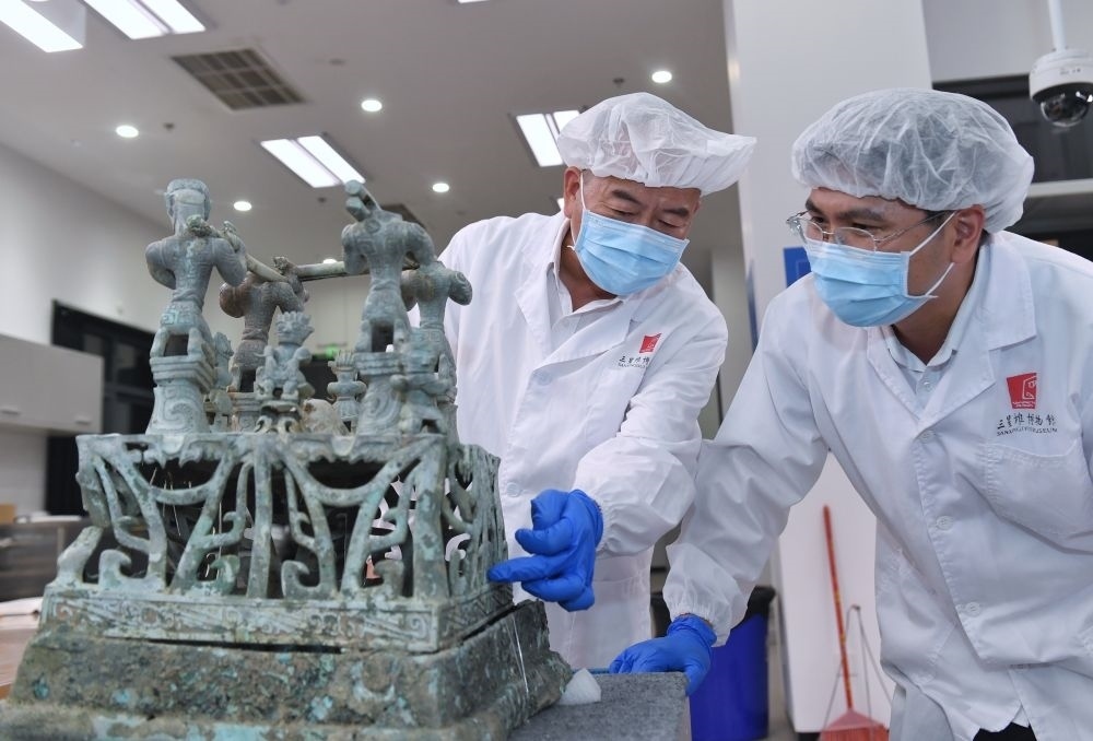 2023年5月30日,在四川三星堆博物館文物保護和修復中心,三星堆博物館陳列保管部副部長郭漢中(左)與同事討論神壇底座修復方案。