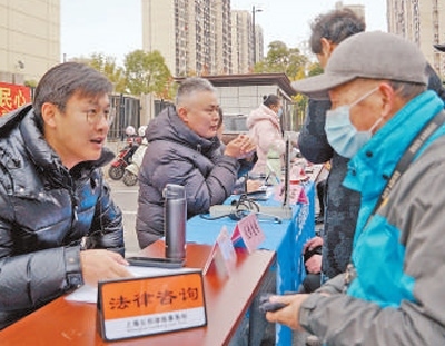 寶山區(qū)新顧城大居拓展區(qū)聯合黨支部開展便民服務活動。圖為工作人員為居民提供法律咨詢。