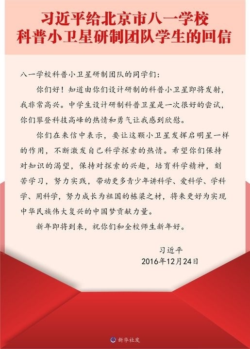 三個(gè)多月后,同學(xué)們給習(xí)近平總書記寫信,報(bào)告小衛(wèi)星即將發(fā)射的消息,很快收到了總書記的回信。習(xí)近平總書記在回信中說(shuō),“你們攀登科技高峰的熱情和勇氣讓我感到欣慰”“希望你們保持對(duì)知識(shí)的渴望,保持對(duì)探索的興趣,培育科學(xué)精神,刻苦學(xué)習(xí),努力實(shí)踐,帶動(dòng)更多青少年講科學(xué)、愛科學(xué)、學(xué)科學(xué)、用科學(xué),努力成長(zhǎng)為祖國(guó)的棟梁之材”。