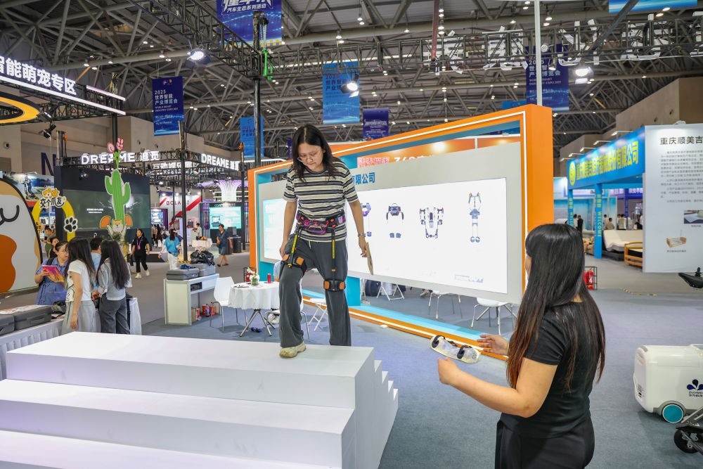 2025年9月5日,在重慶舉行的2025世界智能產(chǎn)業(yè)博覽會上,觀眾體驗外骨骼機(jī)器人。新華社記者黃偉攝