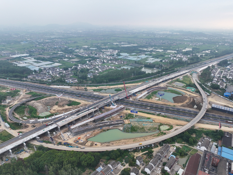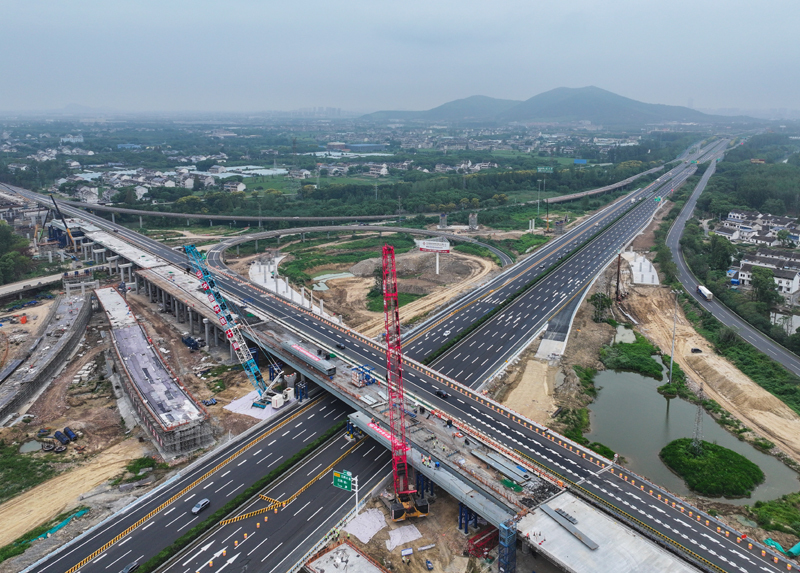 9月13日拍攝的滬武高速公路擴建工程江陰段上跨京滬高速公路鋼箱梁架設(shè)施工現(xiàn)場(無人機照片)。