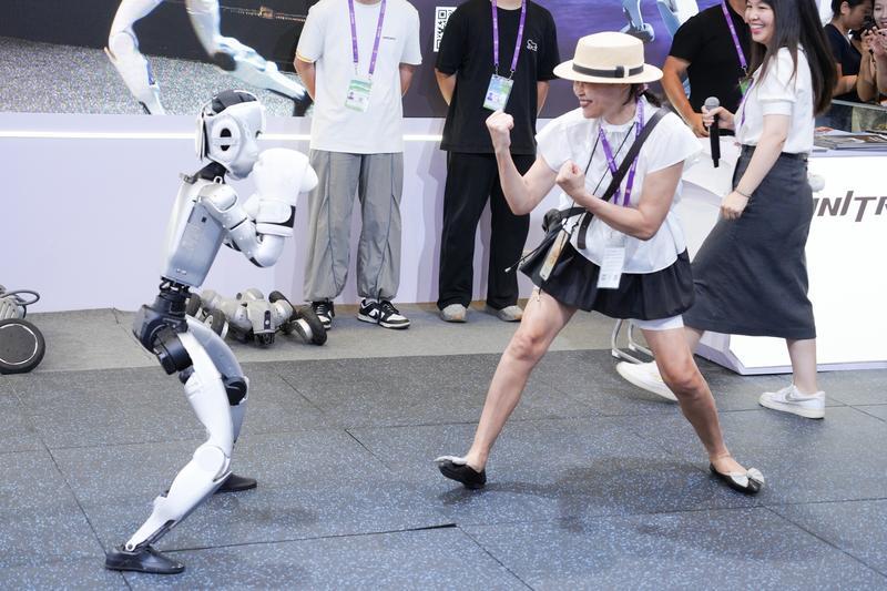2025年9月19日,在廣西南寧國際會展中心人工智能專館,一臺人形機器人和觀眾表演拳擊。新華社記者 周汀鷺 攝