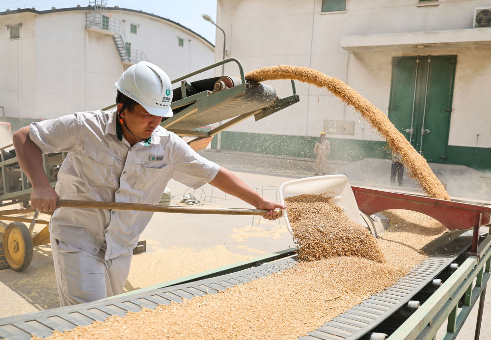 在江蘇連云港市連云區(qū)的中央儲(chǔ)備糧連云港直屬庫(kù)糧食收購(gòu)作業(yè)區(qū),工作人員用傳輸機(jī)傳送小麥入庫(kù)(2025年6月18日攝)。新華社發(fā)(王健民攝)