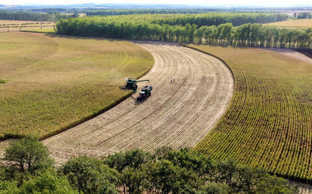 秋高云淡,黑龍江省七臺(tái)河市勃利縣的玉米地里一派繁忙景象。大型收割機(jī)往來(lái)穿梭,飽滿的玉米棒被自動(dòng)精準(zhǔn)收入機(jī)身。脫粒后,金燦燦的玉米粒源源不斷涌入隨行的運(yùn)糧車。