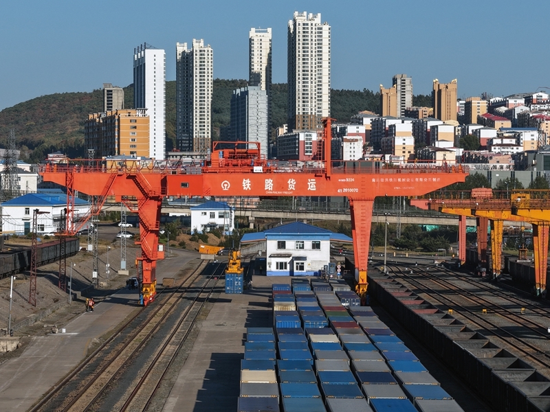 9月27日,滿載貨物的列車在綏芬河站北場進行換裝作業(yè)(無人機照片)。
