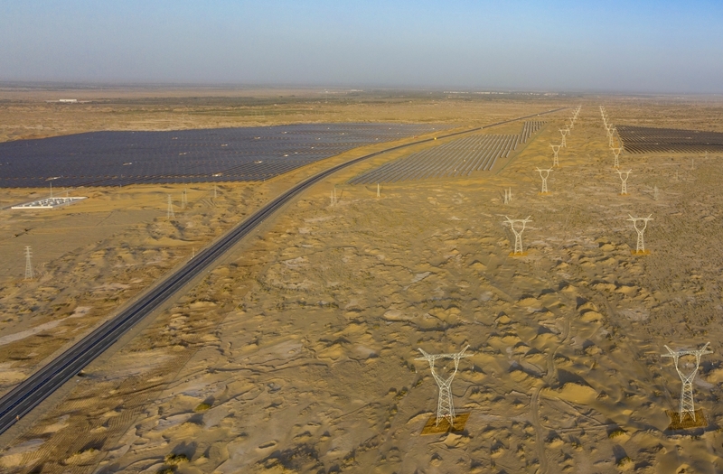 9月22日在新疆巴音郭楞蒙古自治州境內(nèi)的烏若高速附近拍攝的光伏電站和輸電線(無(wú)人機(jī)照片)。