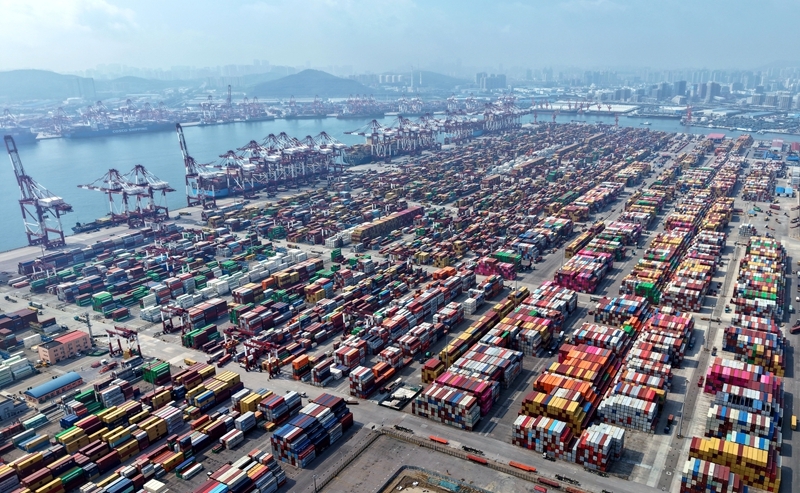這是8月19日拍攝的山東港口青島港前灣港區(qū)海鐵聯(lián)運(yùn)中心堆場(chǎng)(無(wú)人機(jī)照片)。