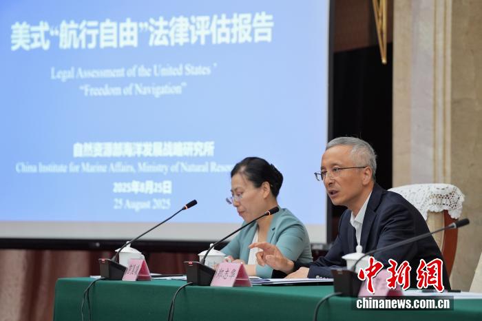 8月25日,中國(guó)自然資源部海洋發(fā)展戰(zhàn)略研究所在北京發(fā)布《美式“航行自由”法律評(píng)估報(bào)告》中英文版。該《報(bào)告》旨在對(duì)美國(guó)“航行自由”相關(guān)主張和實(shí)踐是否符合國(guó)際條約和一般國(guó)際法、是否具備法律基礎(chǔ)進(jìn)行評(píng)估。圖為自然資源部海洋發(fā)展戰(zhàn)略研究所前所長(zhǎng)張海文(右二)答記者問。中新社記者 張祥毅 攝
