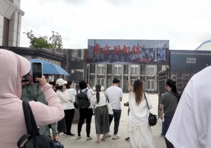 7月26日,觀眾在上海影視樂(lè)園大戲院看完《南京照相館》后前往上海影視樂(lè)園實(shí)景拍攝地參觀。新華社記者 張璟怡 攝