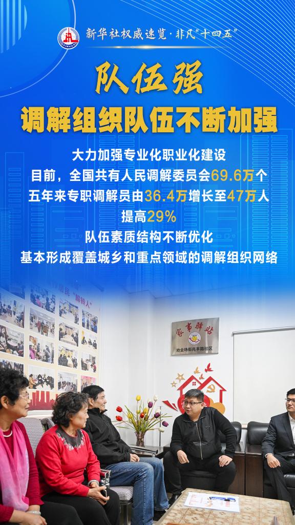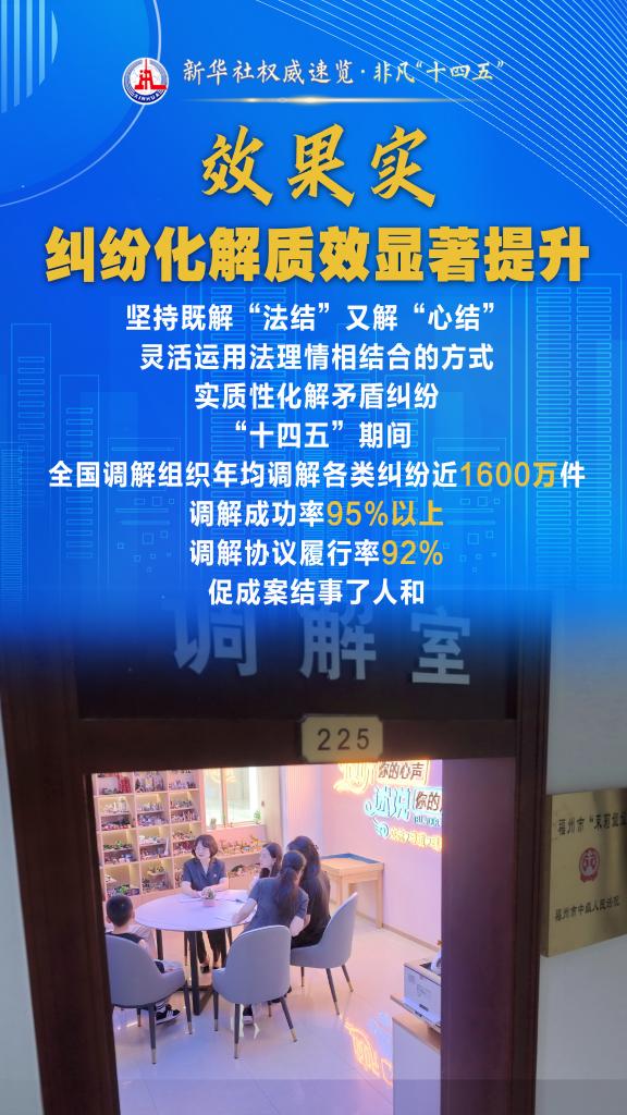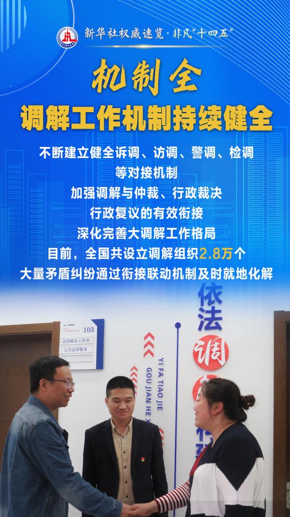 “十四五”期間,司法部堅(jiān)持和發(fā)展新時代“楓橋經(jīng)驗(yàn)”,充分發(fā)揮調(diào)解職能作用,以“機(jī)制全、領(lǐng)域廣、隊(duì)伍強(qiáng)、效果實(shí)”十二字為工作“秘訣”,大力加強(qiáng)矛盾糾紛排查化解,切實(shí)保障群眾合法權(quán)益,維護(hù)社會和諧穩(wěn)定。