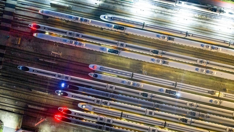 10月10日拍攝的停靠在南京動車段南京南動車運(yùn)用所存車線上的列車(無人機(jī)照片)。