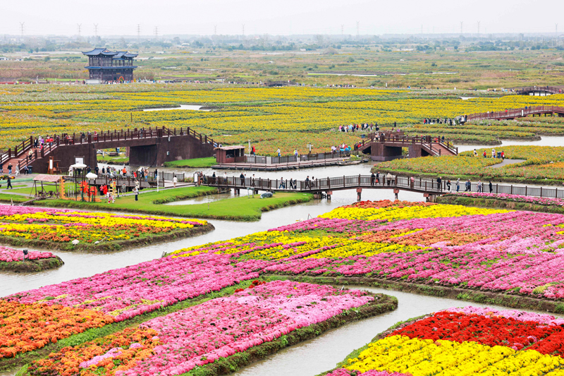10月17日,游客在江蘇省興化市千垛景區(qū)賞菊游玩(無人機照片)。