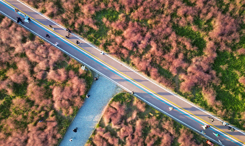 10月18日,游客在山東省東營市東營區(qū)耿井濕地粉黛亂子草“花海”拍照打卡(無人機照片)。