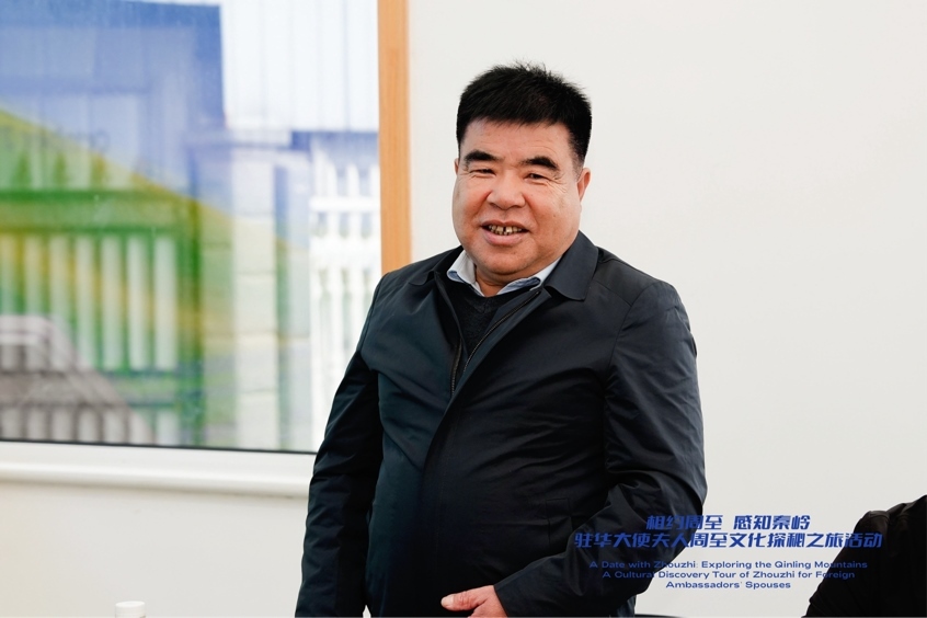 陜西省西安市周至縣樓觀鎮(zhèn)周一村黨支部書記齊平向駐華大使夫人介紹周至獼猴桃的特點及產(chǎn)業(yè)情況