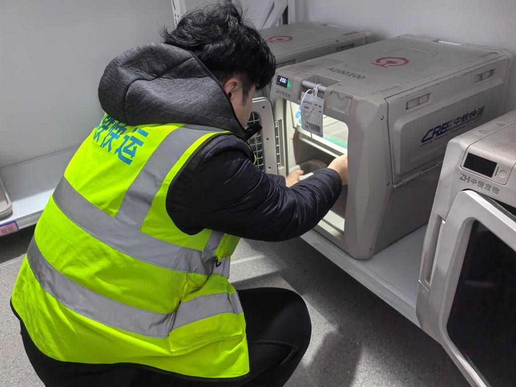 中鐵快運(yùn)太原南站營(yíng)業(yè)部業(yè)務(wù)負(fù)責(zé)人武鑫介紹:“我們自今年10月啟動(dòng)高鐵寵物托運(yùn)服務(wù)試點(diǎn)以來,已經(jīng)托運(yùn)過寵物貓、寵物狗等。旅客可以在12306官方平臺(tái)或到營(yíng)業(yè)部現(xiàn)場(chǎng)辦理托運(yùn)業(yè)務(wù)。托運(yùn)前,需要提交相關(guān)部門的檢疫證明。工作人員會(huì)對(duì)寵物運(yùn)輸箱和列車環(huán)境進(jìn)行嚴(yán)格消毒。寵物運(yùn)輸箱內(nèi)還帶有攝像頭,主人可以通過監(jiān)控查看自家寵物的實(shí)時(shí)狀態(tài)。我們配備的工作人員,也會(huì)定時(shí)檢查寵物狀態(tài),提供必要的安撫和飲水?!?/p>