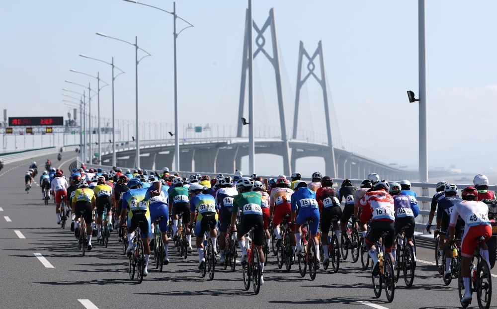 11月8日,參賽選手在港珠澳大橋騎行。當(dāng)日進(jìn)行的第十五屆全國運(yùn)動(dòng)會(huì)公路自行車男子個(gè)人賽,賽道全程231.8公里,選手經(jīng)過港珠澳大橋,跨越粵港澳三地。這是全運(yùn)會(huì)歷史上首次舉辦跨境比賽。新華社記者 毛思倩 攝