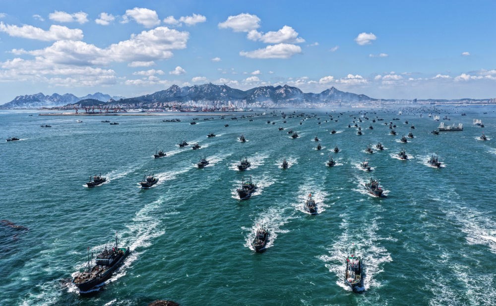 ↑ 在山東省榮成市石島漁港,黃渤海休漁期結(jié)束后,漁民駕駛漁船出海作業(yè)(9月1日攝,無(wú)人機(jī)照片)。新華社發(fā)(李信君 攝)