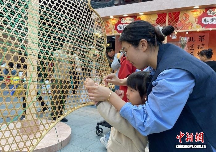 11月14日,2025豫園非遺季在上海豫園商城開幕。圖為小朋友體驗竹編。中新社記者 鄭瑩瑩 攝