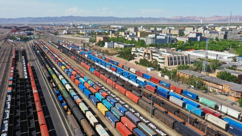 在新疆阿拉山口站寬準(zhǔn)軌編組場,出入境中歐班列集結(jié)等待出發(fā)(2024年5月25日攝,無人機(jī)照片)。新華社發(fā)(于暉 攝)
