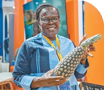 在第八屆進(jìn)博會國家綜合展上,貝寧國家館的工作人員展示貝寧奶油菠蘿。
