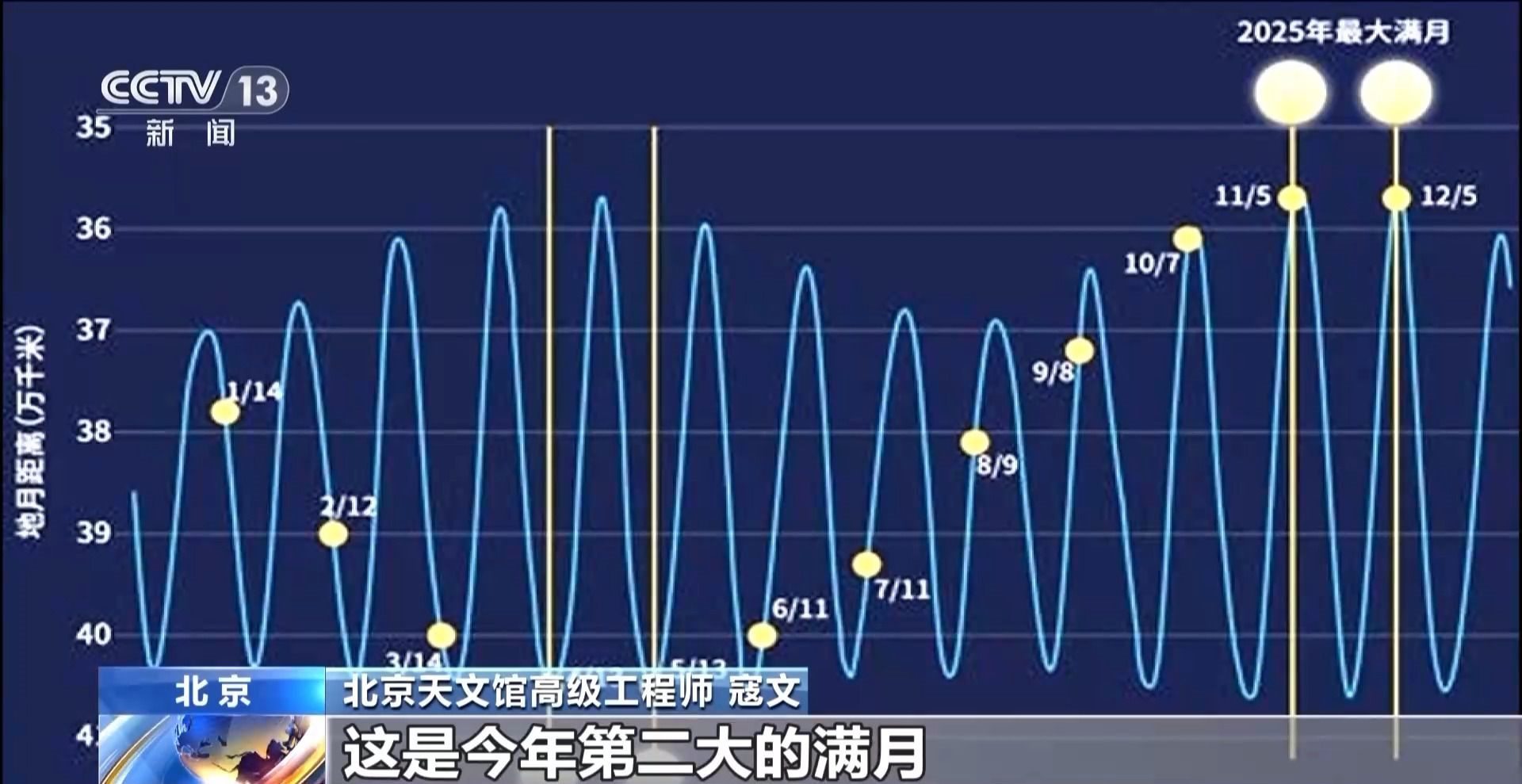 北京天文館高級(jí)工程師 寇文:12月5日大約早晨7點(diǎn)14分是滿月,而月亮過近地點(diǎn)的時(shí)間是在這之前大約12個(gè)小時(shí),這是今年第二大的滿月,也可以算是一次“超級(jí)月亮”。