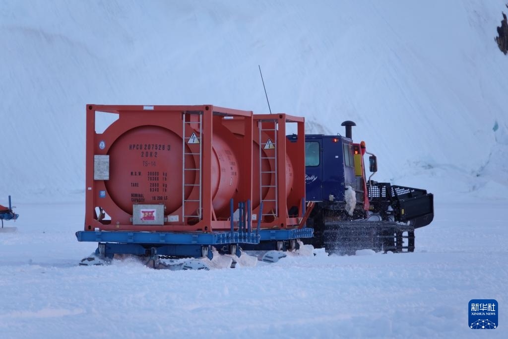 北京時(shí)間12月3日凌晨,雪地車?yán)訚M燃油的油罐離開(kāi)“雪龍2”號(hào),駛向中山站。新華社記者 顧天成 攝